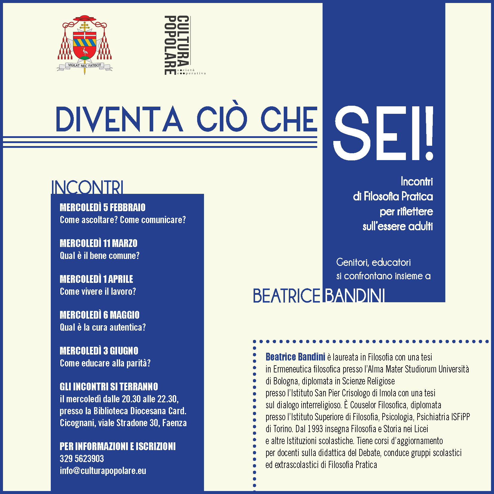 “Diventa ciò che sei!” è una piccola comunità di ricerca per adulti, una serie di incontri di filosofia pratica per riflettere sull’essere adulti. Genitori, educatori si confrontano insieme alla professoressa Beatrice Bandini.
