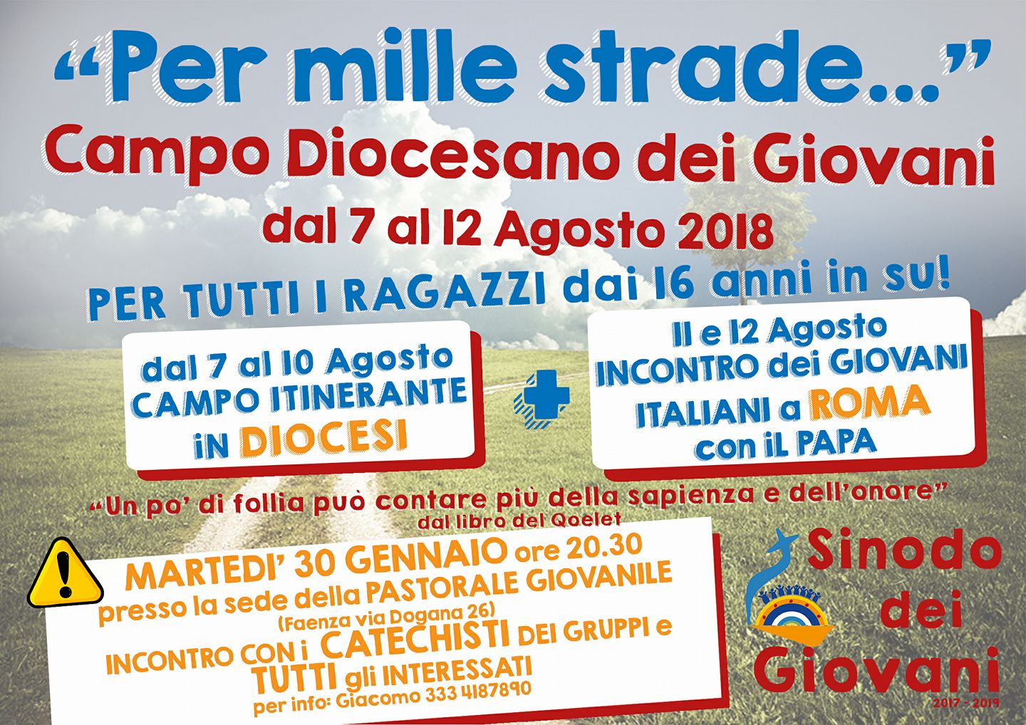 “PROGRAMMI PER L’ESTATE? sei interessato a un campo diverso dal solito con tutti i giovani della diocesi? Sei un educatore di un gruppo giovanile e devi organizzare il campo per i tuoi ragazzi?? Unisciti al nostro cammino!! L’ultima tappa sarà l’incontro dei giovani con il papa a Roma!!! Ti aspettiamo martedì 30 gennaio in PG (Faenza via Dogana 26) per parlarne tutti assieme!